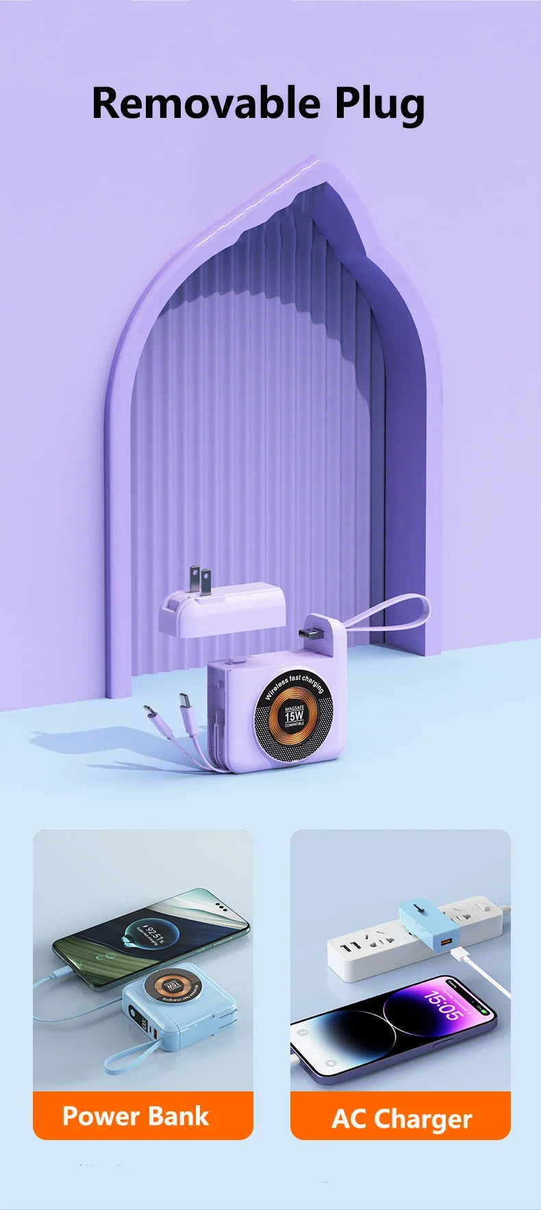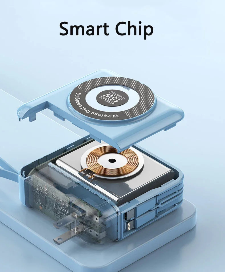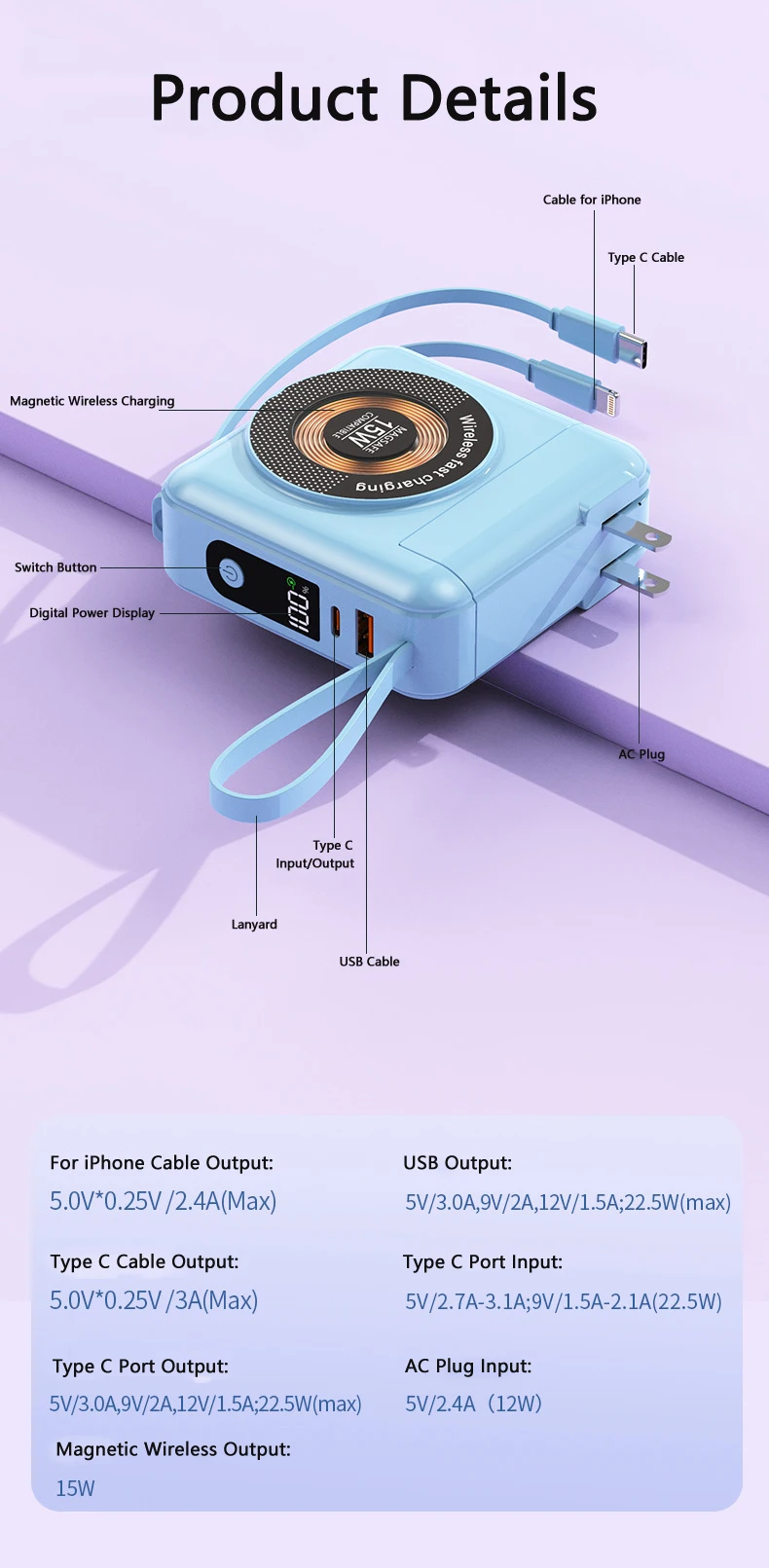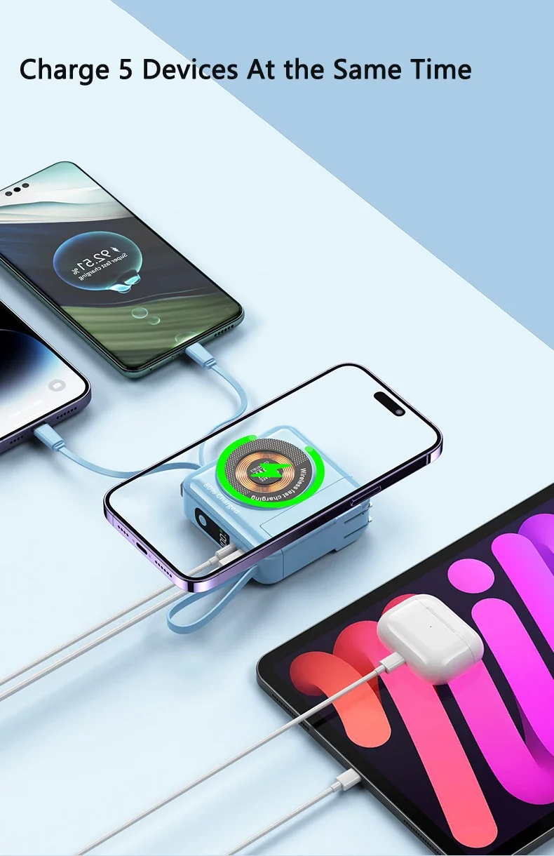 Fonction 5 en 1 --- Banque d'alimentation mobile + Chargement sans fil + Chargement magnétique sans fil + Câble intégré + Chargeur mural